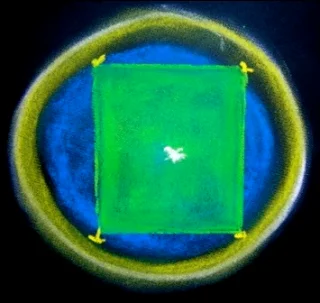 Torus with perfect cube. The lines of the square/walls of the cube are precisely placed relative to the pole and equatorial plane. Once this shape is achieved within the torus, the Platonic shapes and all regular geometry are possible.